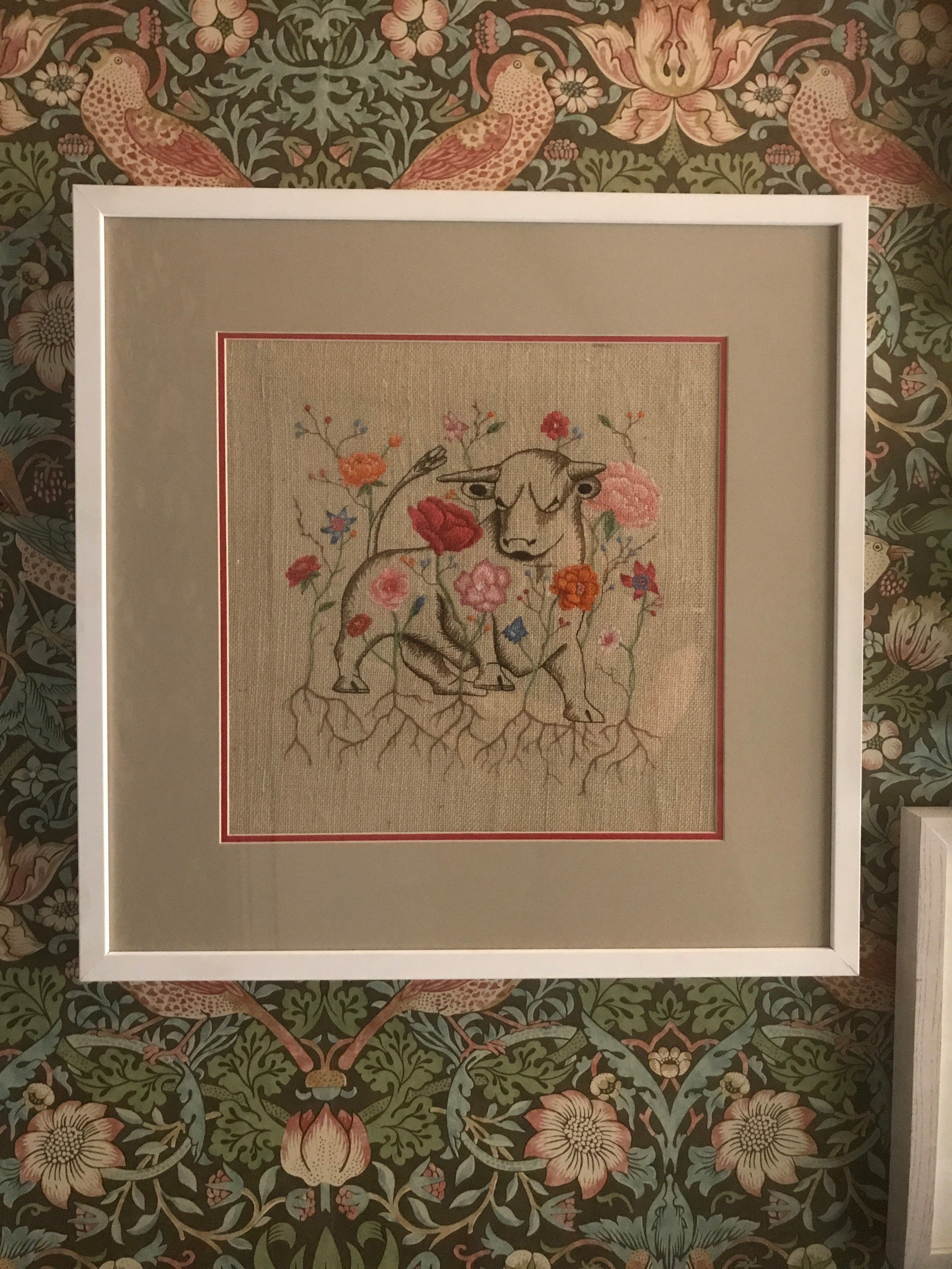 C: Fjona wanted something Birmingham-centred (and what more so than the Bullring Bull!). She’s also seen some of my work and said that she really liked the florals, so wanted to merge those things into one piece. We went back and forth with drafts; tweaking the size, changing the flowers. Fjona wanted it to represent both the city and the countryside as Hampton Manor is the place that breaches the gap between the two and yet celebrates both. The way that the flowers look like they’re coming out of the bull represents the good things that are coming out of the city.